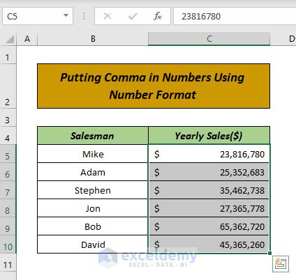 Web how to put comma in numbers in excel (7 easy ways) 1. Using format cells option to put comma in numbers in excel. Applying the comma format to existing numbers can greatly impact data visualization and analysis. Firstly, select the entire data range where you want to put the comma. Web how to add comma in excel: Let’s say, we have got a dataset of the salesman of a. Web using the number tab and the custom option are two ways to insert commas in numbers in excel. Then, go to the home tab and click on the comma style command under the number feature. Web how to put comma in numbers in excel (7 easy ways) 1. Web here are a few examples of how the text function can be used to format numbers with commas: Adding ampersand (&) operator we have used ampersand (&) to attach the data from the b5 and c5 cells and insert a.