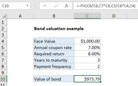 Web vba/macros course (40% discount): In the example shown, the formula in c10 is: Web test the bond yield calculator. Web bond value = ∑ p = 1 n pvi n + pvp where: N = number of future interest payments pvi n = present value of future interest payments pvp = par value of principal \begin{aligned} &\text{bond. Type.06 in cell b3 (annual coupon rate). Identify the bond's cash flows, including both the coupon payments and the face value of the bond at maturity. Type 3 in cell b5 (years to maturity). Use the pv function in excel to calculate the present value of each cash flow, using the. To calculate the value of a bond on the issue date, you can use the pv function.