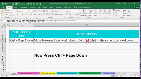 Ctrl + Page Down Shortcut Key with Example in MS Excel Spreadsheet 2016